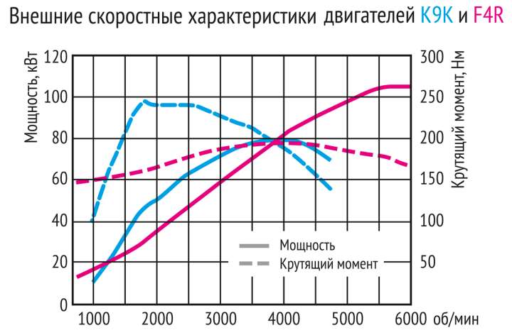 За руль двухлитровой бензиновой версии я пересаживался неохотно, потому что был уверен, что узость моментного кругозора здесь усугубится еще и общим дефицитом тяги. Сел, поехал и — прозрел… Да, бензиновый двигатель серии F4R (143 л.с.) куда менее тяговит (195 Нм при 4000 об/мин), но вот вам наглядная демонстрация того, что удобство управления тягой играет куда более важную роль, чем абсолютные показатели отдачи! Здесь такая же короткая первая передача, трансмиссия «нарезана» с очень близким шагом, однако благодаря пологой кривой момента без завала в зоне низких оборотов (см. графики внешних скоростных характеристик) бензиновый двухлитровый Дастер на динамичном бездорожье воспринимается куда более покладистой машиной. Он менее шумен, резвее при активной раскрутке и лучше сглаживает небрежности при переключении передач.
