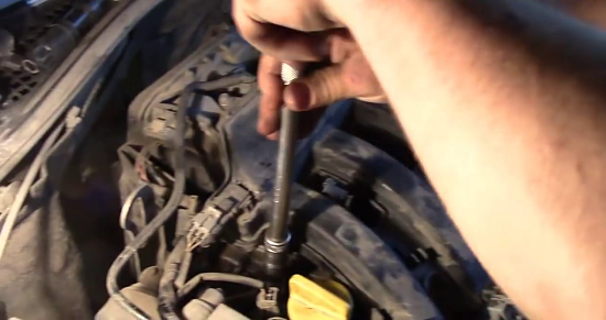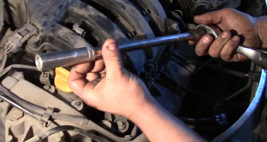 Затем с помощью длинной свечной головки, диаметр которой составляет 16, можно выкручивать старые свечи зажигания.