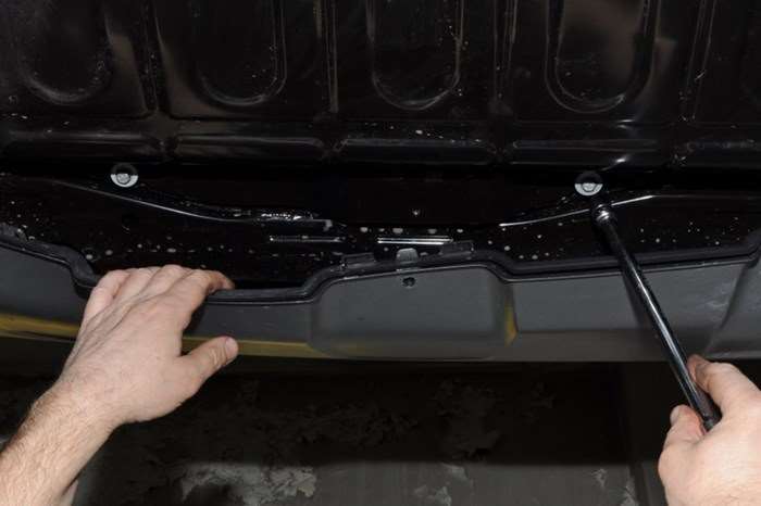 С помощью ключа Torx T-30 откручиваем три болта крепления бампера к защите двигателя и два болта крепления бампера к подрамнику.