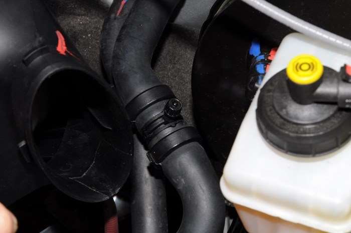 Как только полностью слилась старая ОЖ. Одеваем патрубок и хомут и можно приступать к заливке новой жидкости. Проверим, чтобы колпачок штуцера для спуска воздуха так же был завернут.