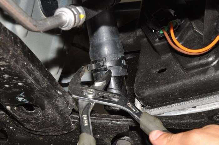 Видим нижний патрубок радиатора. Аккуратно снимаем с него хомут, снимаем патрубок и жидкость начинает выливаться. Для того, чтобы старая ОЖ более интенсивно сливалась, можно открутить пробку расширительного бачка и колпачок штуцера (выпуска воздуха из системы охлаждения), расположенного на шланге подвода жидкости к отопителю (воздушный фильтр для наглядности снят).