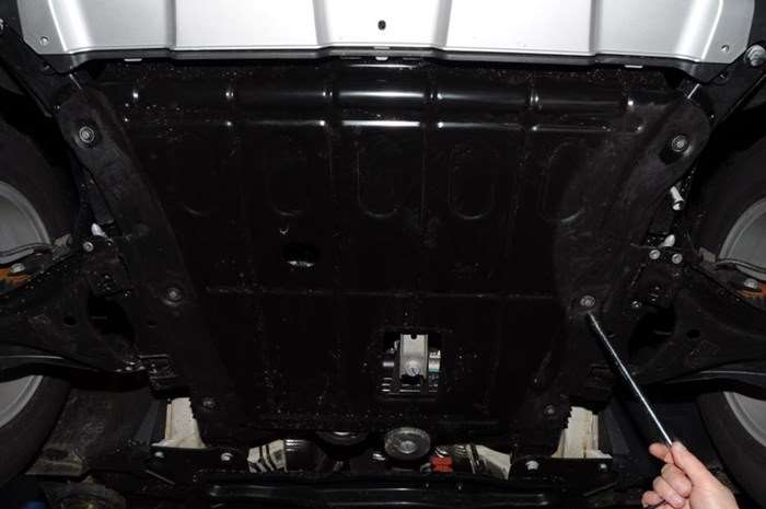 Далее головкой на 10 откручиваем болты крепления защиты двигателя. Для этого придется немного отогнуть бампер.