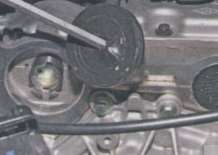 Удерживая ролик в этом положении, затягиваем гайку его крепления. Провернув коленчатый вал на два оборота по часовой стрелке за болт крепления шкива привода вспомогательных агрегатов, снова проверяем натяжение ремня и при необходимости повторяем регулировку